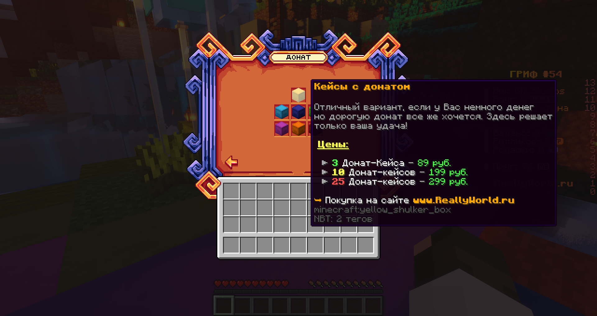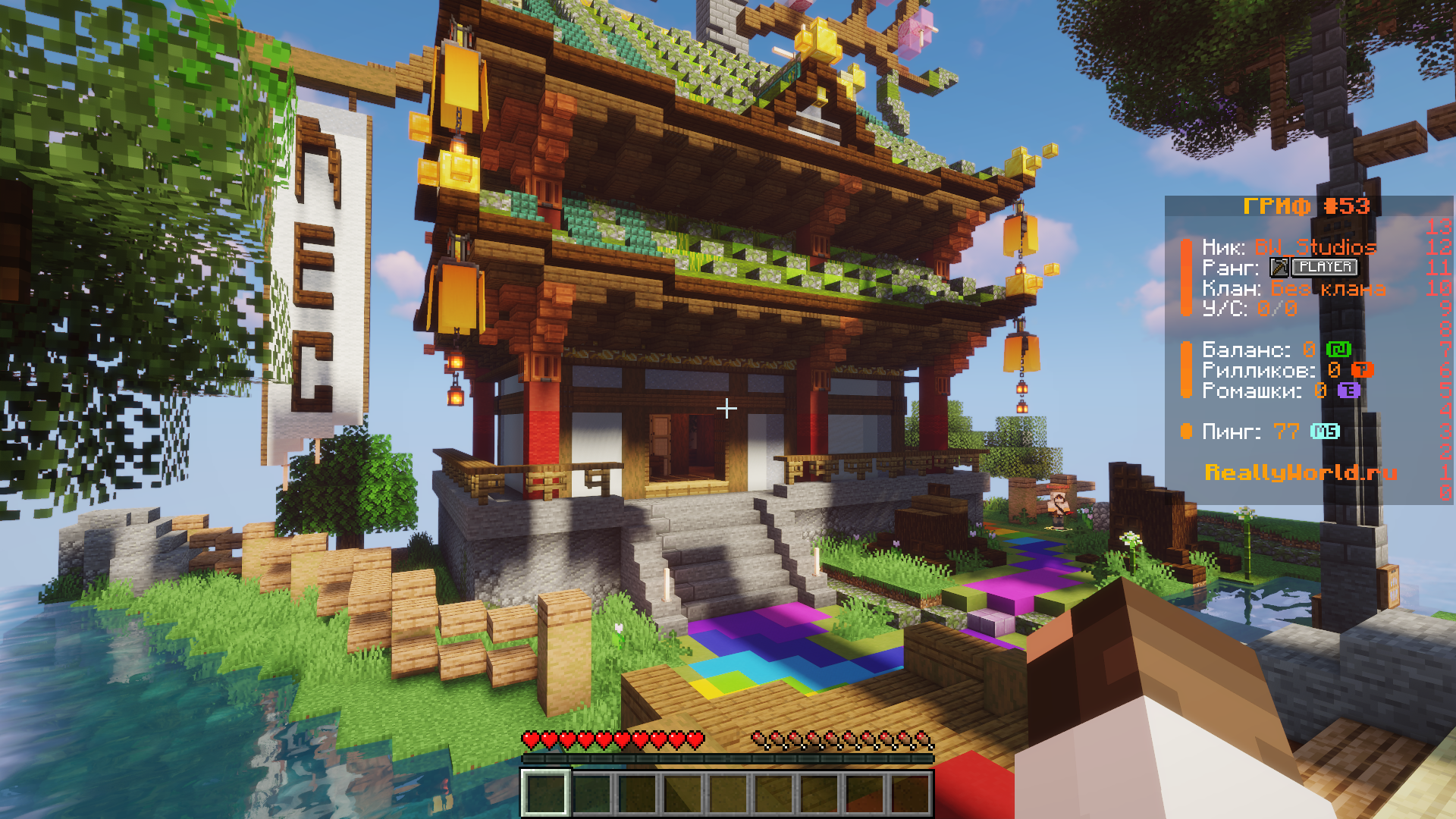 Лобби ReallyWorld выполнено в фирменном стиле с использованием кастомного текстур‑пака, который создаёт неповторимую атмосферу. Мир сервера сочетает в себе уникальные ландшафты с кастомной генерацией, детализированные города и уютные зоны для строительства. Здесь вы найдёте как безопасные поселения для торговли и отдыха, так и опасные территории с боссами и ценными ресурсами.