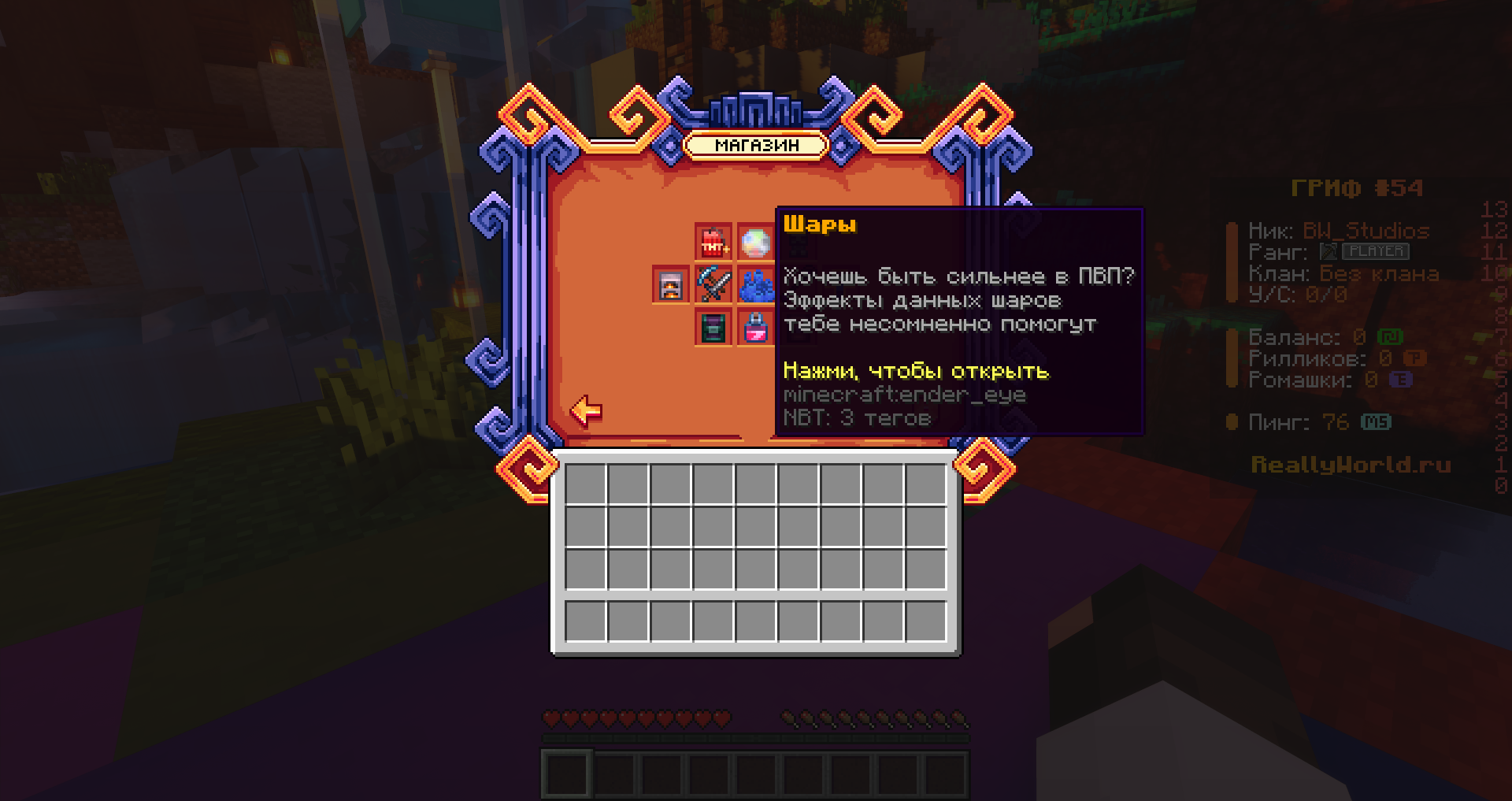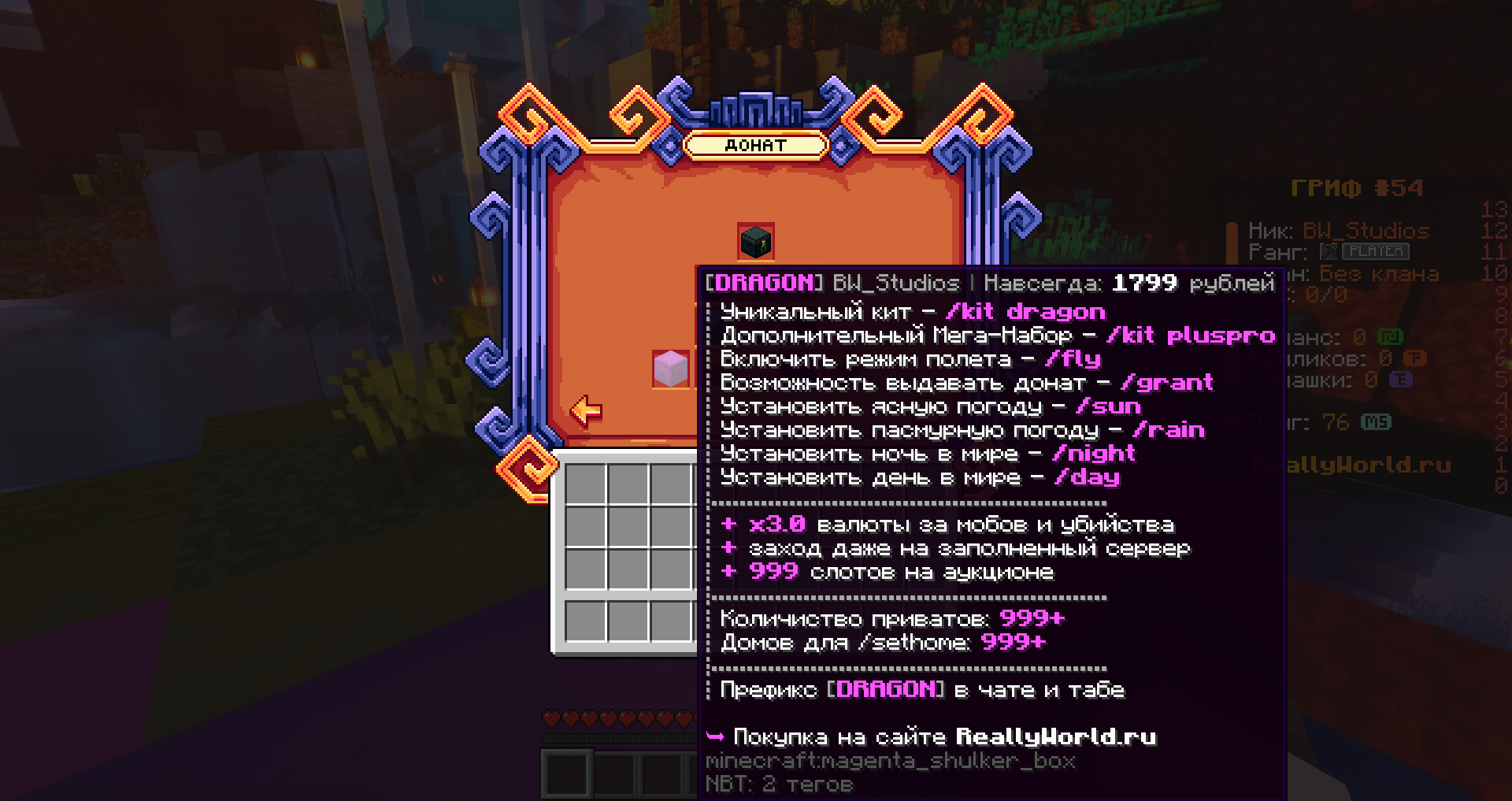 ReallyWorld — это сервер выживания нового поколения с проработанным открытым миром, квестовой системой и уникальной атмосферой. Вас ждёт красивое лобби с фирменным текстур‑паком, продуманная система прогрессии, магазины и экономика, которая делает каждый ресурс ценным. Здесь каждый день — это новое приключение: исследуйте мир, выполняйте квесты, торгуйте и стройте свою империю.